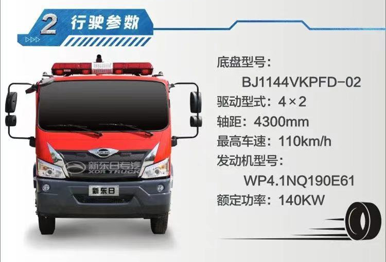底盤配置:福田190馬力(140KW)國六發動機,底盤型號:BJ1144VKPFD-02,發動機型號:WP4.1NQ190E61,軸距:4300,雙排駕駛室,帶空調。